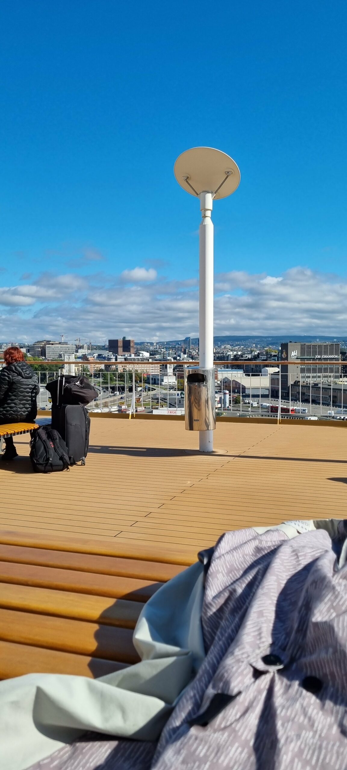 Været er like fint denne helga – om enn litt kjøligere. Det merkes at det er september. Men vi satt på dekk en stund også denne gangen. Forhåpentlig går vi ikke på et skjær, slik Kielerfergen gjorde sist vi prøvde oss. Da kom vi ikke lenger enn til Moss
